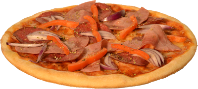 mit Pizza Blitz-Tomatensauce, Mozzarella, Salami, Hinterschinken, Paprika, Zwiebel und Knoblauch